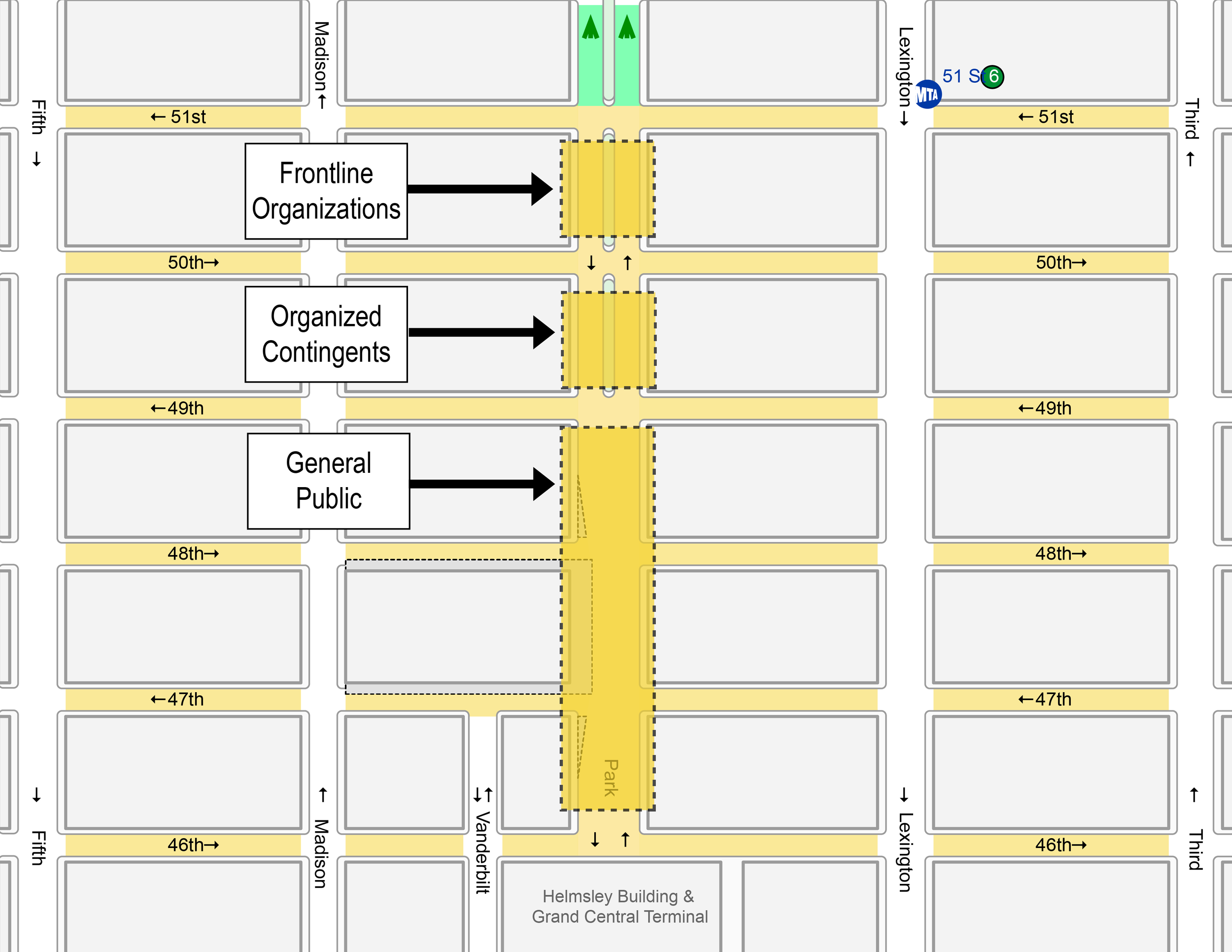 The march will start on Park Ave. The general public should line up between 46th and 49th Street, individuals coming as part of a community organization and organized contingent should line up between 49th and 50th Street, and folks who are representing frontline communities should line up between 50th and 51st Street.